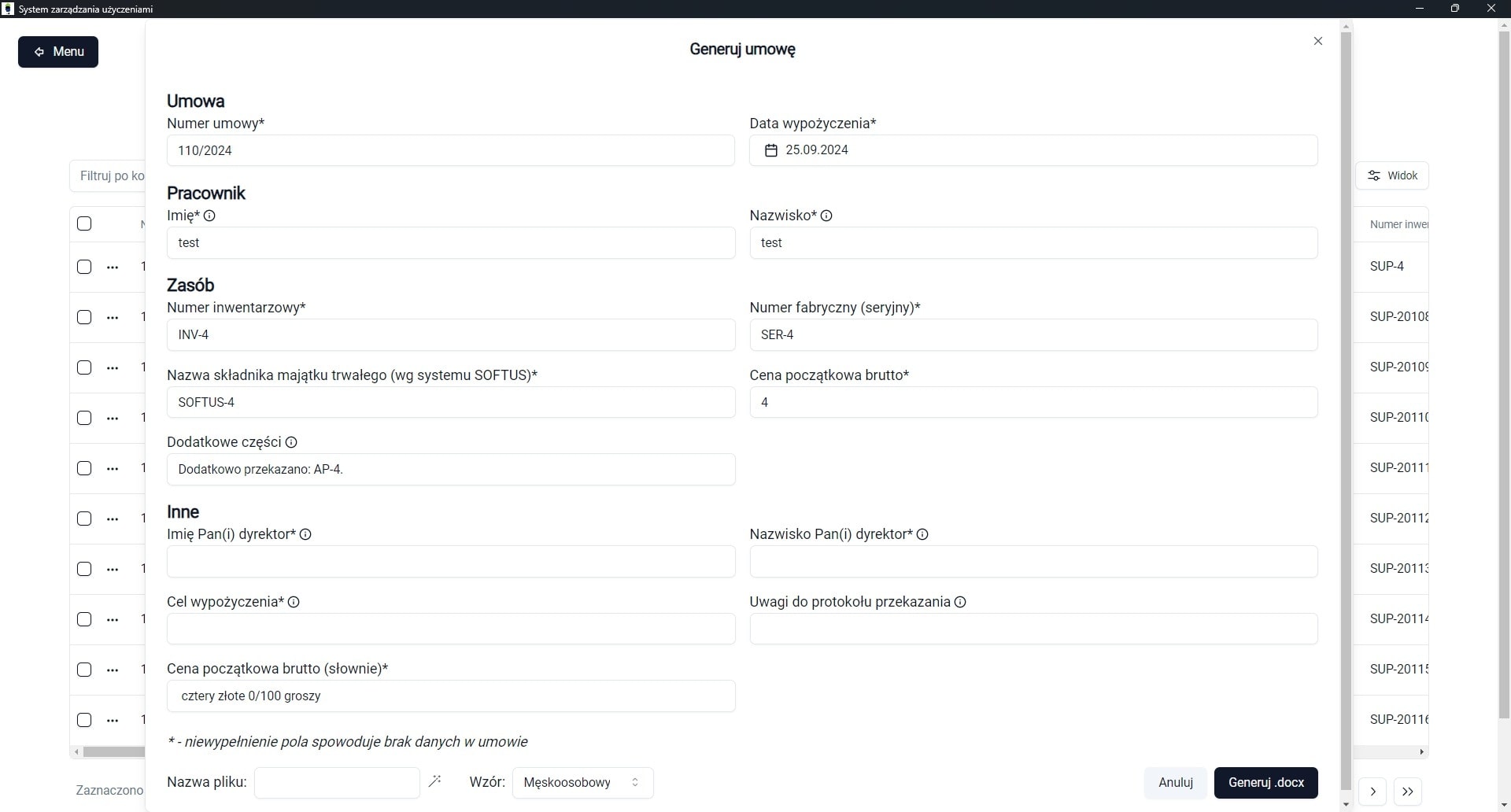 A desktop application that automatically generated equipment loan agreements for employees. Built during an internship at the Statistical Office.